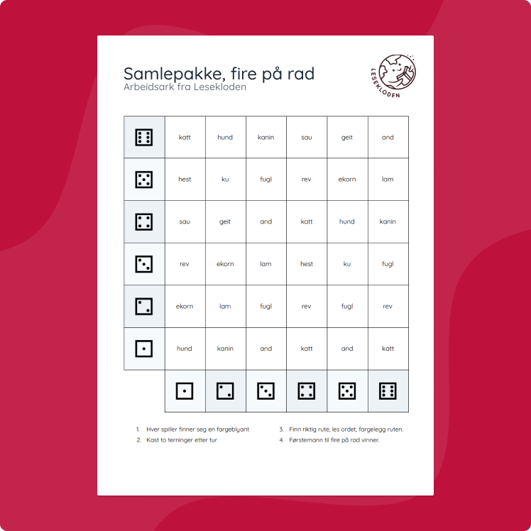 Gjør glosetrening morsommere med denne par-aktiviteten. Barna kaster terning, fargelegger riktig rute og ser hvem som får fire på rad først.